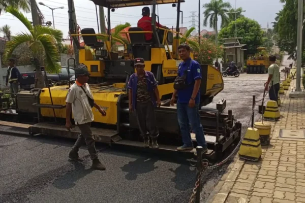 Proses pengaspalan jalan dilakukan dengan memanfaatkan peralatan berat yang canggih dan terkini untuk mempercepat penyelesaian pekerjaan.